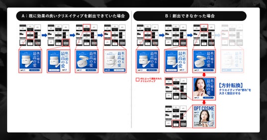 ここまでの過程で、A:すでに十分効果のよいクリエイティブを創出できていた場合、以降は、何度も同じ広告の出稿を繰り返すことでユーザーが見飽きてしまわないよう、定期的に変化をつけていくといった方針を取ります。一方、ここまでの過程で、B:十分効果のよいクリエイティブを創出できなかった場合、以降は、制作の方向性自体を疑う必要があります。