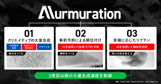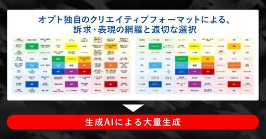 「新しい価値創造を通じて産業変革を起こし、社会課題を解決する。」をパーパスに掲げ、LTVM(LTV Marketing)(※1)により、顧客の事業成長を先導する株式会社オプト(本社:東京都千代田区、代表取締役社長 CEO:金澤 大輔、以下、オプト)は、機械学習技術を用いたサービス企画・開発を手がける、Re Data Science株式会社(本社:千葉県柏市、代表取締役社長:高田 悠矢、以下、Re Data Science)(※2)と共同で、3つのAIでPDCAサイクルの質を上げ、高い広告効果を実現するクリエイティブ制作ソリューション「Murmuration: Sequential Generator(マーマレーション)」による支援を開始したことをお知らせいたします。