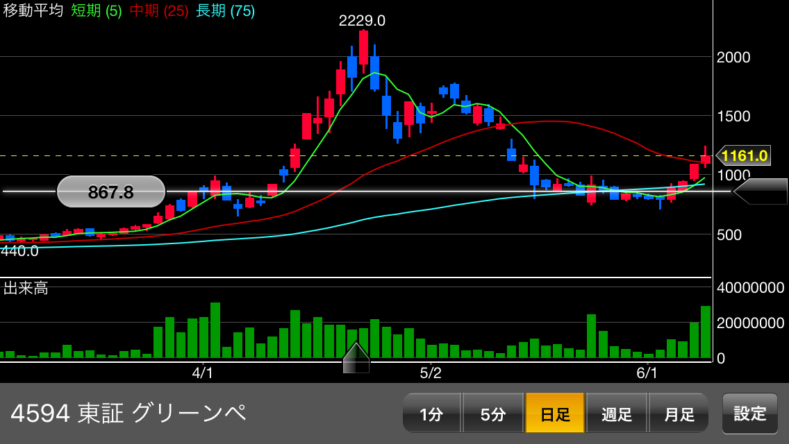 グリペプ躍進、ブラン・アキュセラはS高と新興は大盛り上がり(日本ラッドやりすぎ)☆アライドアーキを引き続きガチホ、寝てればいいんです。 ★4594 グリーンペプタイド(がん治療・バイオ関連)1,000円大台を死守できるかを最優先。日柄調整が上手く進んだ場合、6/17日(金)を目印に株価上昇の可能性。