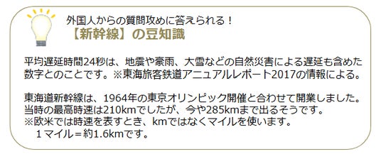 日本についての知識も得られるテキストですが、細かすぎる説明ではなく、外国人相手にわかりやすく伝わる「概要の説明」を英語で学習できる内容となっています。相手に合わせて、豆知識や、あなたの国の~の何個分(サッカー場の○個分、等)の大きさ」「あなたの国のスターで言うと○○さんのような人」のような、会話を楽しむトピックについても学ぶことができる内容です。