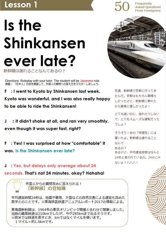 日本人として海外にいると、日常的に日本社会や文化について質問を受ける機会が多いという声から、改めて日本について学び、どのように英語で表現するかを習得できるレッスンとなっています。50の質問は、実際に海外に住まわれた方の体験に基づいた質問と回答を中心に構成しています。