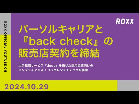 株式会社ROXX(本社:東京都新宿区、代表取締役:中嶋汰朗、東証グロース:241A、以下 ROXX)は、2024年10月29日、パーソルキャリア株式会社(本社:東京都港区、代表取締役社長:瀬野尾 裕 、以下パーソルキャリア)とオンライン完結型コンプライアンス/リファレンスチェックサービス『back check』の販売店契約を決議したことをお知らせいたします。これにより、パーソルキャリアが運営する、26万件以上(※)の求人を有する転職サービス「doda(デューダ)」( https://doda.jp/ )を利用する求人企業へ『back check』の展開に取り組んでまいります。※2024年10月28日時点