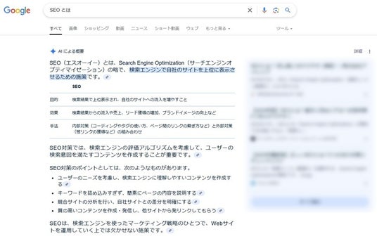 Google検索に導入されたAI Overviews(AIによる概要)は、検索キーワードに対するAIによる回答の要約を、検索結果に表示する新機能です。2024年8月から日本でも一般的に利用できるようになりました。 (※1)