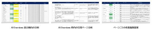 - 改善提案各ページについて、AI Overviews 枠内への表示や、枠内への安定した表示のためのコンテンツ設定などの改善施策をご提案いたします。
