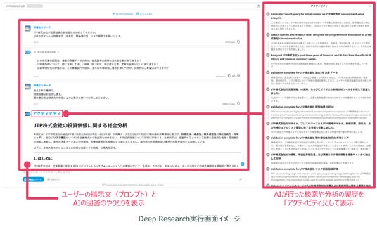 生成において必要な観点をAIがユーザーに問いかけることで、ユーザーが求める回答に近いかたちで、生成結果をレポートとして出力します。また、レポート作成過程において、AIが行った検索や分析の履歴を「アクティビティ」としてユーザーが確認できるため、透明性や納得感の高い結果を得ることができます。