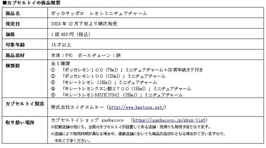 サッポロホールディングス(株)のグループ企業であるポッカサッポロフード&ビバレッジ株式会社(代表取締役社長:時松浩、本社:愛知県名古屋市)は、10月5日の「レモンの日」にちなみ、ロングセラーブランドである「ポッカレモン100」及び「キレートレモン」から、5種類のミニチュアチャームを展開します。ミニチュアチャームは全国のカプセルトイ取り扱い店にて2024年10月下旬から順次販売されます。