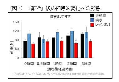 (3)「茹で」後の経時的変化への影響として、調理後1時間、2時間経過したレモン果汁において、「変形しやすさ」が有意に低下し、時間が経過しても鶏肉が硬くなりにくいことが確認されまし