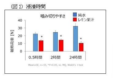(1)レモン果汁では、浸漬0.5時間以降「噛み切りやすさ」の尺度となる破断荷重が有意に低下し、茹でた鶏肉がやわらかくなることが確認されました。(図2)
