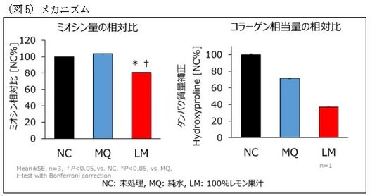レモン果汁では、レモンのクエン酸の作用によって鶏肉のpH(※8)が酸性に偏ることで保水率の上昇が見られました。また、クエン酸が浸透することで、鶏肉が硬くなる要因である筋原線維タンパク質(主にミオシン)や、結合組織タンパク質(主にコラーゲン)の分解・溶出が促され、鶏肉にやわらかさを与えることが確認されました。(図5)
