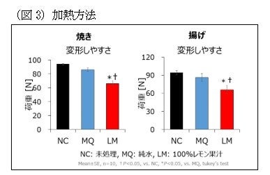 (2) 2時間レモン果汁に浸漬した鶏肉は「焼き」および「揚げ」において「変形しやすさ」の尺度となる荷重の値が有意に低下し、加熱方法に問わずレモン果汁への浸漬でやわらかくなることが確認されました。(図3)
