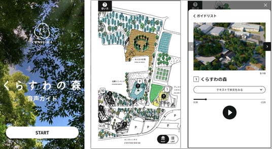 「デジタル音声ガイド」は、施設内の各エリア・コンテンツに関する歴史や説明を聴くことができる「施設案内」と、『くらすわの森』に隠れた10種の“もののけ”に関するオリジナルエピソードを聴くことができる「もののけコンテンツ」で構成されています。