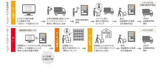 当社がノウハウを有するIoT技術を活用したスマート・オペレーションの展開を進めていくことで、生産性が高く、高品質なオペレーション体制の構築を加速させるとともに、労働負荷の低減による将来的な人手不足、人材確保という課題解決を図っております。また、スマート・オペレーションの展開においては、訪問先・訪問ルートの提案や補充商品数の最適化等、一部業務にAI機能を導入しており、各自販機における商品セットの提案や季節に合わせた商品のホット/コールド切り替えスケジュールの提案等を展開しております。