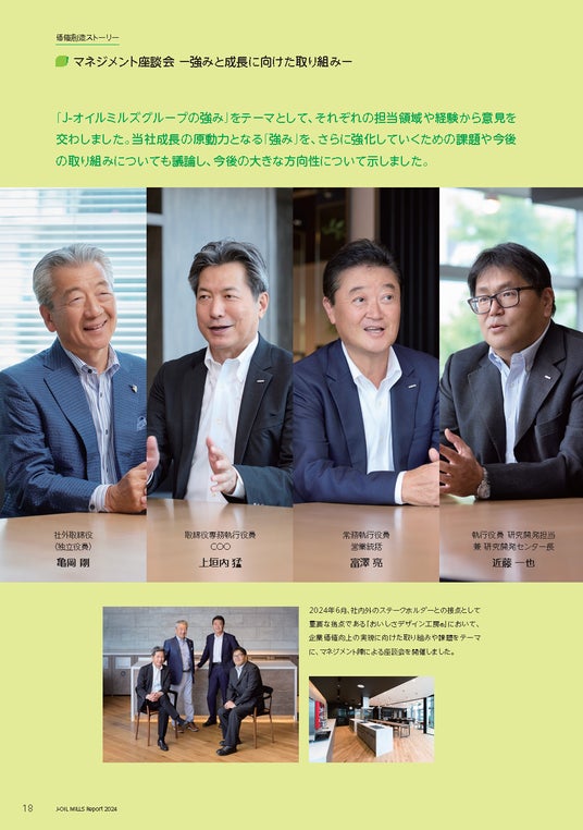 2.マネジメント座談会 -強みと成長に向けた取り組み-(P18~23)「当社グループの強み」をテーマに実施した、役員4名による座談会の様子を掲載しています。社外取締役(独立役員)亀岡 剛、取締役専務執行役員 COO上垣内 猛、常務執行役員 営業統括 富澤 亮、執行役員研究開発担当 兼 研究開発センター長 近藤 一也が、当社の強みである「おいしさデザイン(R)」をさらに強化し、課題を解決するためにソリューション、人財、知的財産、dX(※2)推進の切り口で議論し、今後の方向性について示しました。