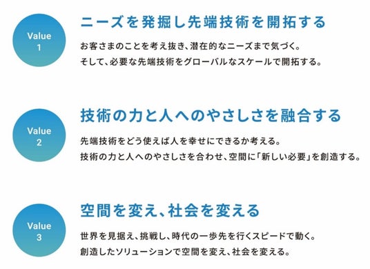 当社は、パーパス実現に向けた価値観および行動基準である「バリュー」を下記のとおり策定しました。