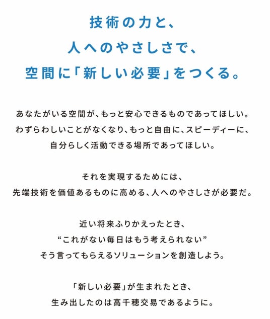 この歴史を振り返ると、『技術の力』と『人へのやさしさ』の追求が、絶えず高千穂交易の根底にありました。私たちは、創業時から受け継がれてきたこの価値観を大切にしながら、すべての事業に通ずる領域である“空間”において、『新しい必要』となるソリューションを創造し、社会に新しい価値を提供していきます。