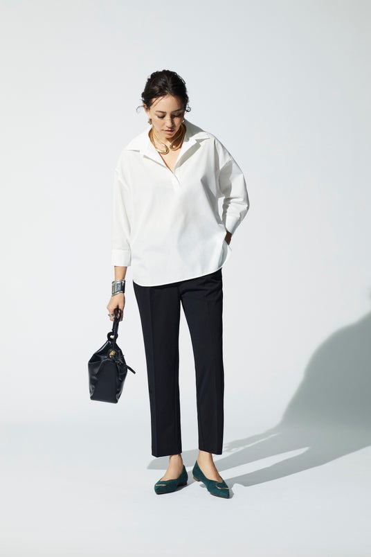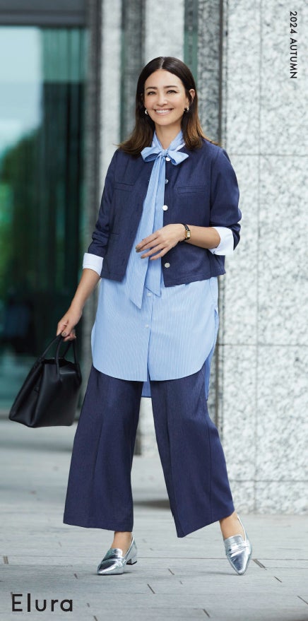 今回の秋ビジュアルでは、Eluraのブランド価値を体現するように過去2年間に渡りロングセラーを記録し、累計7万本を販売した「サマ見えリラクシーテーパードパンツ」を着用していただきました。履き心地はもちろんお手入れもラクなのにキレイ見えすることと、オンもオフも使える汎用性に加え、豊富な5サイズのバリエーションで展開いたします。