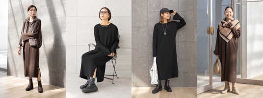 1枚で完成するニットワンピースは通常サイズに加え、低身長サイズも展開。