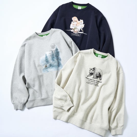 商品は、あさひやま動物園で人気のペンギンやトナカイ、ホッキョクグマ、キタキツネなど複数の動物たちをグラフィックや刺繍を用いてデザインに施した遊び心が溢れるウィンターアイテムコレクションです。アパレルは、動物のモチーフを総柄で表現したカーディガンや冬に映えるカラー展開のニット、動物たちのグラフィックを施した裏起毛スウェット、ボーダー柄にワンポイントの動物ワッペンが特徴的なロンTEEの4型を展開いたします。服飾は、冬にかかせないポンポン付きニット帽、動物モチーフの刺繍がフロントに施されたキャップ、ワンポイントと総柄デザインの2Pセットソックスの3型を展開いたします。