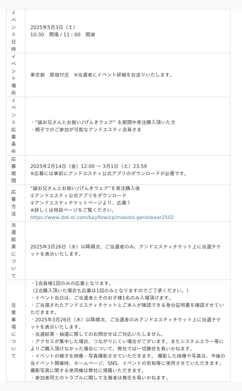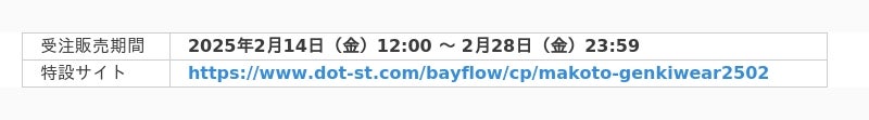 さらに、期間中『げんきウェア』を受注購入していただいた方には、5月3日(土)に行われる “誠お兄さんのシークレットイベント” への応募が可能となります。イベントに参加するキッズたちは、誠お兄さんとお揃いで2ショット撮影のチャンスも!!? たくさんカラダを動かす日にも、お出かけの日にも、ルームウェアにもなる『げんきウェア』で、誠お兄さんと元気いっぱいに思い出となるひと時をお楽しみいただけます。