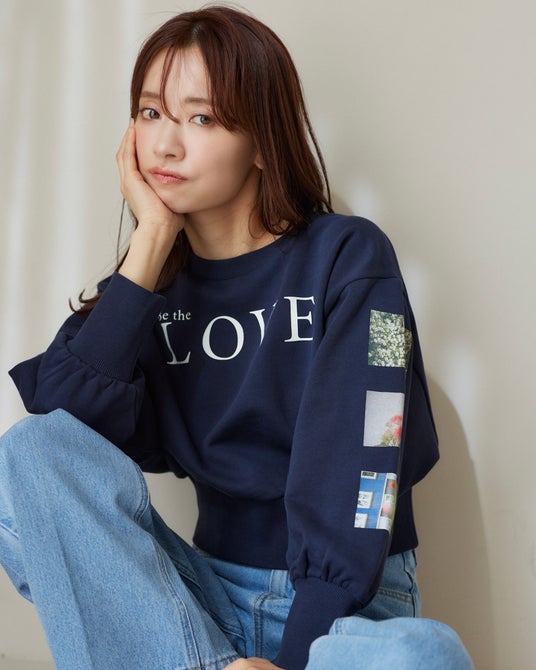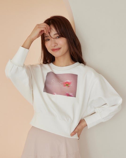 ショート丈でバランスがとりやすく、ハイウエストのボトムスと相性抜群のスウェット。フロント、アームプリントの2パターン展開。ふんわりとした袖も、大人かわいくコーディネートのアクセントになり、薄すぎず厚すぎない、程よい生地感の裏毛スウェットです。