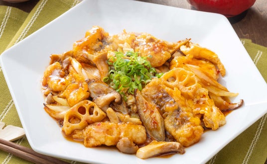上質な脂とあっさりとした味わいが特徴の愛媛県下灘産の鱧を贅沢に使った甘酢炒めです。カラッと揚げた鱧に、醤油のコクと生姜の風味が効いた特製和風甘酢ダレがよく絡みます。4種の茸の食感も楽しめる、ご飯が進む一品。