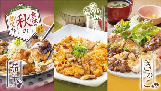 秋に美味しい「茄子」「鱧」「きのこ」がバラエティ豊かな料理で楽しめる『大戸屋 にっぽんの食堂』。軟骨入り鶏つくねをジューシーな茄子で挟んだ「茄子の挟み揚げと鶏唐揚げの茸あんかけ」(定食価格:税込1,340円)のほか、旨みたっぷりな下灘の鱧を使用した「鱧とたっぷり茸の和風甘酢炒め」(定食価格:税込1,480円)、もろみ醤油で煮詰めた茸ソースが鶏肉の旨みを引き立てる「もろみ茸ソースの鶏もも肉炭火焼き」(定食価格:税込1,280円)。食欲の秋は、今しか味わえない日本の味を大戸屋で。