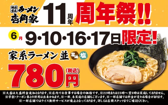 ~2025年6月9日、10日、16日、17日で『家系ラーメン並』を税込780円でご提供~