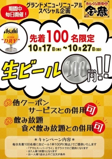 この度のグランドメニューリニューアルに連動して、10月17日(木)から10月27日(日)の期間にご来店くださったお客様の中から先着100名様限定で1杯100円(税込)で生ビールをご提供いたします。