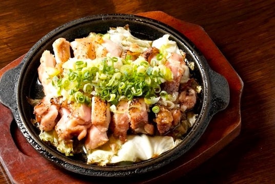 あつあつの鉄板にのったボリューム満点の「葱塩チキングリル」 768円