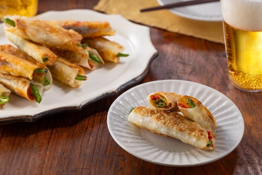 <ししとうとチーズのピリ辛包み焼き>ビールのキリッとした後味と一緒にお楽しみください!