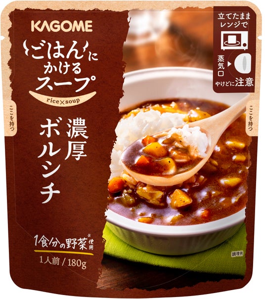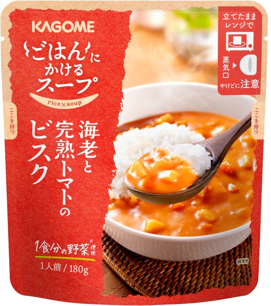 「ごはんにかけるスープ」は、特別な味わいと具材感が楽しめて、野菜をたっぷり使用した、ごはんにかける濃厚なスープです。“海老と完熟トマトのビスク”は、乳のコクや魚介・トマトなどのうま味が詰まった濃厚なビスクに、“濃厚ボルシチ”は、牛肉やトマト、たまねぎなどのうま味とコクが感じられる濃厚なボルシチに仕立てました。2品とも、常温でストックできる1食使い切りタイプで、レンジで袋のまま温め、ごはんにかけるだけで簡単な主食が作れます。常温でも冷やしても食べられます。また、パンと一緒に食べても美味しくお召し上げりいただけます。