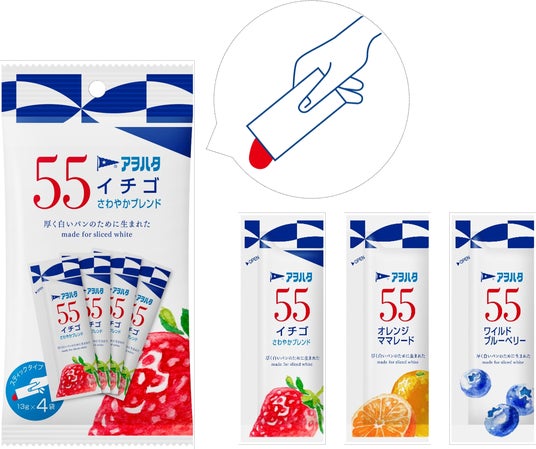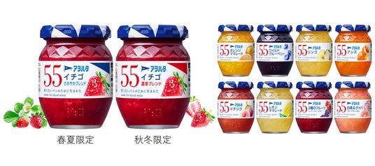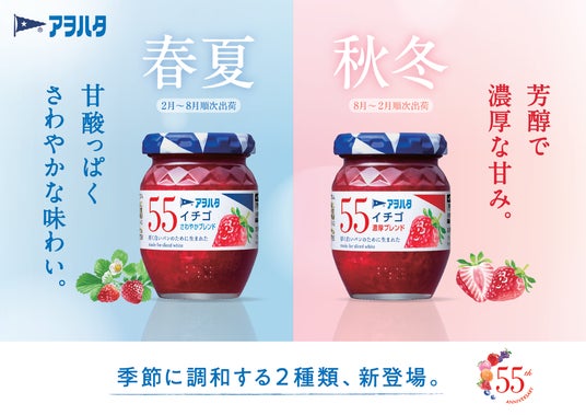 アヲハタ株式会社(本社:広島県竹原市、代表取締役社長:山本範雄)は、今年発売55周年を迎える低糖度ジャム『アヲハタ 55』を全品リニューアルします。一番人気のイチゴは春夏限定発売の「さわやかブレンド」と秋冬限定発売の「濃厚ブレンド」の“季節に調和する2種類”が誕生。原料のブレンドや製法を変えることで、日本初の取り組み※1として季節に合わせたおいしさを実現しています。さらにシリーズ全品の食パンとの相性をさらに高めると共にパッケージデザインを刷新します。