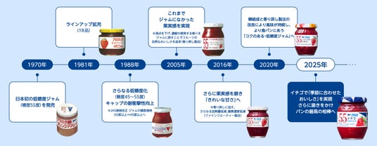 日本人の朝食の主食はパンが最も多く35%を占めます※2。『アヲハタ 55』は、食卓においしさと楽しさを届けるため“パンの最高の相棒”として時代に合わせて進化しています。今回、食パンと合わせた際の香りやフルーツの濃さ、味わいをアップさせ食パンとの相性をさらに高めることに成功しました。“厚く白いパンのために生まれた”というキャッチコピーで独自価値の発信を強化していきます。