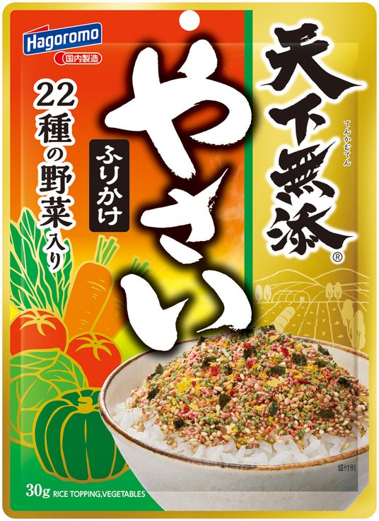はごろもフーズ株式会社(本社:静岡県静岡市 社長:後藤佐恵子)は、『天下無添』ふりかけシリーズに22種類の野菜を使った「天下無添やさいふりかけ」と、着色料・甘味料不使用の「天下無添のり弁慶ふりかけ」の2種を発売します。