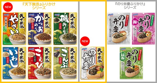 当社のふりかけ製品は、『天下無添』ふりかけシリーズと『のり弁慶ふりかけ』シリーズが、ユニークな製品名と明確な製品コンセプトで、お客様にご好評いただいています。今回発売する「天下無添のり弁慶ふりかけ」は、そのどちらの特長も兼ね備えた製品です。お客様のお好みに応じて、豊富な製品ラインアップからお気に入りの製品を見つけてください。