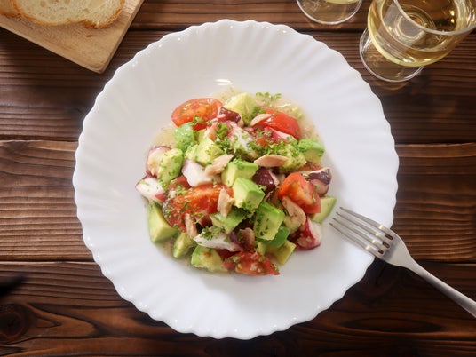 1. ゆでたこは一口大に切ります。アボカドは半分に切って種を取り、皮をむいて一口大に切ります。プチトマトは4等分にします。