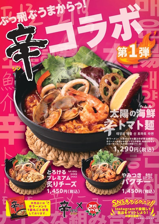 トマトラーメンの専門店「太陽のトマト麺」(運営:株式会社一品香)は、日本でも人気の韓国即席麺ブランド「辛ラーメン」とコラボレーションした「辛ラーメン×トマト麺」コラボフェアを1月21日(火)より開催。「太陽のトマト麺」と「辛ラーメン」(農心ジャパン)が共同開発したコラボ商品『太陽のヘムル“辛”トマト麺』をコラボフェア第1弾として期間限定で発売いたします。また「辛ラーメン×トマト麺」フェアに合わせて、SNSキャンペーンを実施いたします。