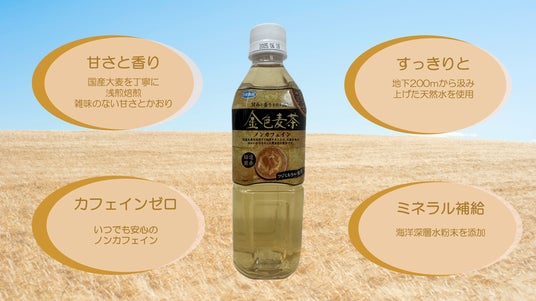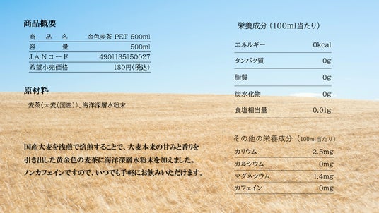 「当社は、ミネラル麦茶を日本文化に昇華した元祖ミネラル会社として初心を忘れず、創業者が目指した美味しい麦茶をペットボトルにて再現致しました。金色に輝く麦茶の色合いと香りをお楽しみください。来夏に向けて携帯飲料を強化して参ります。」