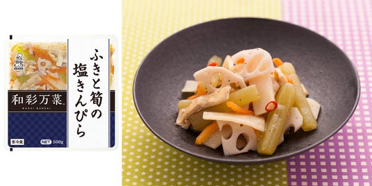 ふき、たけのこ、れんこん、にんじん、油揚げの見た目や彩り、食感にこだわった和惣菜です。かつおと鶏の風味がいきた塩味をベースに、黒こしょうでアクセントをつけています。素材を大きくカットしていますので、インパクトがあり食べごたえも満点です。