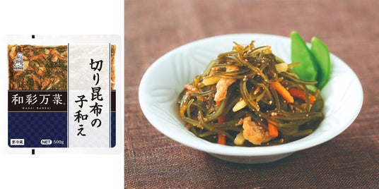 切り昆布やにんじん、たけのこ、油あげを焼き明太子フレークで和えました。素材の美味しさをお楽しみいただけるよう薄味に仕立てています。具材は小鉢に盛り付けやすいサイズです。