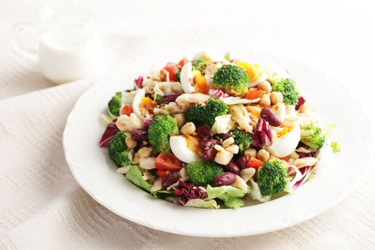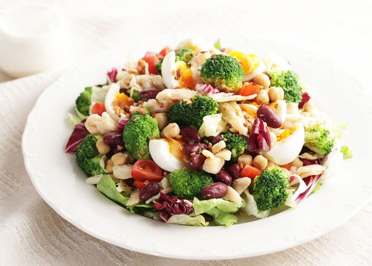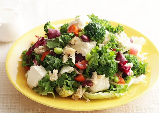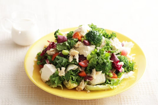 たんぱく質が豊富な蒸し鶏、豆腐、豆類に、栄養価の高いケールが入った健康を意識した美サラダです。100gあたり約5.9gのたんぱく質を摂ることができます。