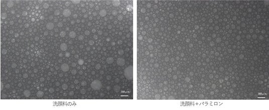 パラミロン原末を配合した洗顔料と配合していない洗顔料を用意し、それぞれを同じ方法で2分間泡立てました。その結果、パラミロン原末を配合した洗顔料の泡の方がよりきめ細やかな泡立ちとなりました(図5)。
