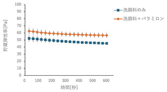 また、パラミロン原末を配合していない洗顔料の泡では、スプーンをのせると、泡の中に沈んでしまいますが、パラミロンを配合した洗顔料では、スプーンをのせても泡の中にスプーンが沈まず、泡が弾力を持っていることが分かりました。実際に、泡の弾力の指標としてそれぞれの泡の貯蔵弾性率※7を調査したところ、パラミロン原末を配合した洗顔料の泡において、パラミロン原末を配合していない洗顔料の泡と比較して、泡の貯蔵弾性率が高くなっていました(図6)。これらの結果は、洗顔料へのパラミロンの配合によって、より弾力ある泡立ちが得られることを示しています。