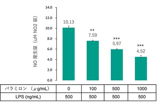 図4:マクロファージのNO産生量の変化 ***p<0.001,**p<0.01 t検定(ボンフェローニ補正) vs. パラミロン 0 μg/mL