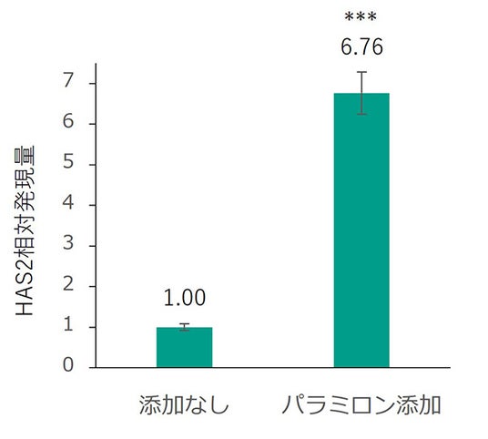 本研究では、ヒト由来の免疫細胞であるTHP-1マクロファージにパラミロン原末を添加して培養したあと、その培養上清を皮膚線維芽細胞に添加して、ヒアルロン酸合成酵素の遺伝子発現に与える影響を調べました。