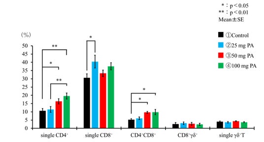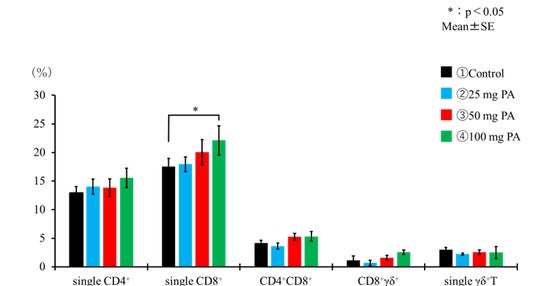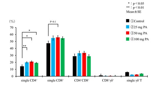 試験終了時におけるニワトリの平均体重は1.Controlと他の試験区間に有意な差はありませんでしたが、獲得免疫に関わるT細胞の分化が起きる一次リンパ器官である胸腺のリンパ球サブセット解析では、CD4陽性T細胞の相対的比率が1.Controlに対してその他の試験区全てで有意に高くなりました。CD8陽性T細胞の相対的比率は1.Controlに対して3.50mgPAで高くなる傾向(P=0.1)でした(図1)。