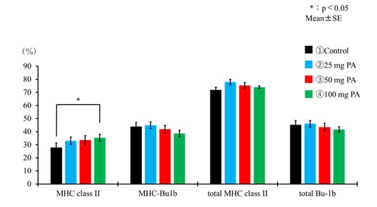 同じく二次リンパ組織である盲腸扁桃のサブセット解析においてCD8陽性T細胞の相対的比率は1.Controlと比較して、4.100mgPAで有意に高くなりました(図3)。また、B細胞の相対的比率はMHC classII発現B細胞で1.Controlに対して4.100mgPAで有意に高くなりました(図4)。