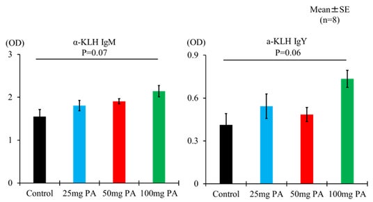 14日齢時にニワトリの翼静脈中にKLH抗体を投与して21日齢時に血中のKLH特異的抗体価(IgMおよびIgY)を測定したところ、血中IgMは1.Controlに対して、4.100mgPAで高くなる傾向(P=0.07)があり、血中IgYは1.Controlに対して、4.100mgPAで高くなる傾向(P=0.06)がありました(図5)。