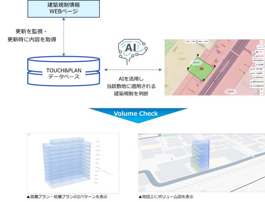 TOUCH&PLANは、まずTASUKI TECH LAND上で取得した敷地情報と、用途地域・斜線制限・日影規制などの規制要件を満たした建築可能容積を決定します。算出された建築可能容積に対して、さらに天空率(角地・対面等)と行政ごとの建築条例を加味して計算処理を行い、複数パターンの建築ボリュームプランを作成します。その中から、1フロアあたりの面積を抑え、垂直方向での面積増加を重視する高層プランと、1フロアあたりの面積を最大限取り、水平方向での面積増加を重視する低層プランの2パターンのパース・平面図・設計概要書・収支計画書を作成し出力します。