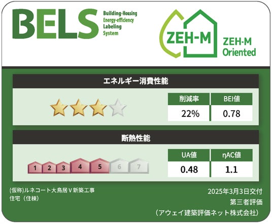 『ZEH-M Oriented』認証を取得した「(仮称)ルネコート大鳥居V」では、断熱性能などを大幅に向上させるとともに、高効率な設備システム導入によって、外皮平均熱貫流率(UA値※1)0.48の評価を取得し、かつ、国が定める一次エネルギー消費量における基準値からの削減率22%(BEI値※2=0.78 )の評価を取得しました。